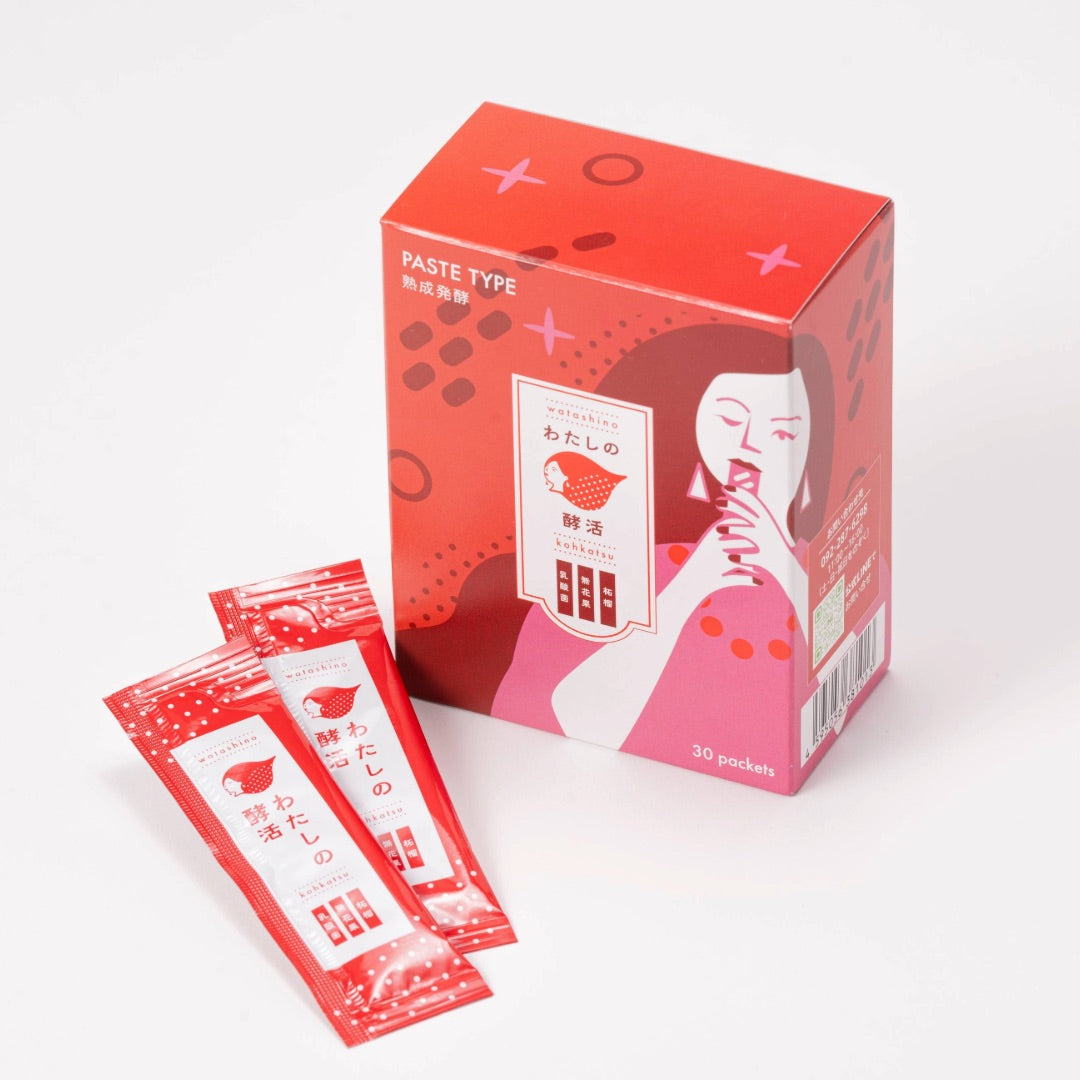 WATASHI no KOHKATSU is a fermented paste-type femcare supplement designed to support women in their 30s and 40s through subtle physical and emotional fluctuations. Created for women's wellness, it combines traditional Japanese fermentation methods with nutrient-rich local ingredients from regions like Fukuoka.