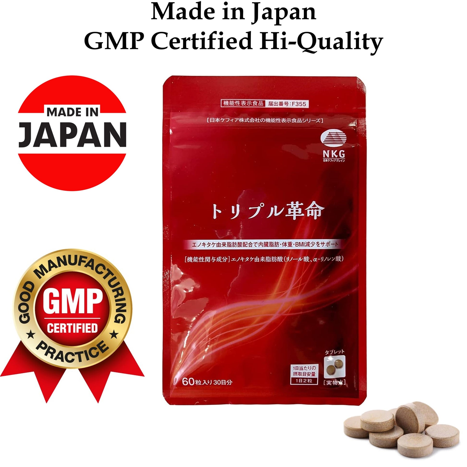 Triple Revolution is one of the best-selling weight loss supplements in Japan. Its formula has proven effective through human clinical studies with Japan's top universities. Based on these studies Triple Revolution is officially recognized by the Japanese Government to reduce visceral fat, BMI, and body weight. Additionally, it is proven safe through tests and 5 years of sales. Thanks to its natural ingredients and patented Enoki Mushroom extract.