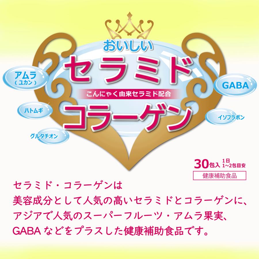Health supplement combining ceramide and low-molecular fish collagen with amla and GABA. Red grape flavor stick packs.